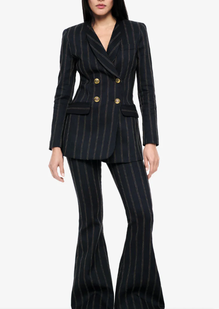 Smythe blazer adorned with gold-tone buttons and a vented back for added flair. It features a V neckline, long sleeves with button cuffs, a chest welt pocket, and front flap pockets. With a tailored fit that hits below the hips, this blazer is crafted from wool and lined with polyester for a polished look.