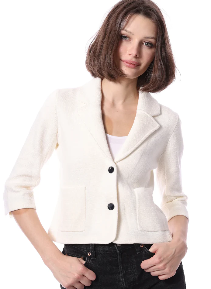 Elevate your wardrobe with our Cotton Blend Shrunken Blazer! This blazer is the epitome of chic and modern style, designed to enhance your fashion game effortlessly. Made from a comfortable cotton blend, it offers a luxurious feel while allowing for breathability. The front pockets add a touch of functionality and practicality, perfect for keeping your essentials close at hand. With classic lapels, this blazer exudes timeless elegance and sophistication. The 3/4 sleeves bring a contemporary twist, adding a hint of playfulness to your ensemble. Unlined for a lightweight feel, this blazer is perfect for layering and adding a polished touch to any outfit. Whether you're dressing up for a professional setting or creating a smart-casual look, our cotton blend shrunken blazer is a versatile and stylish choice that will elevate your style to new heights.