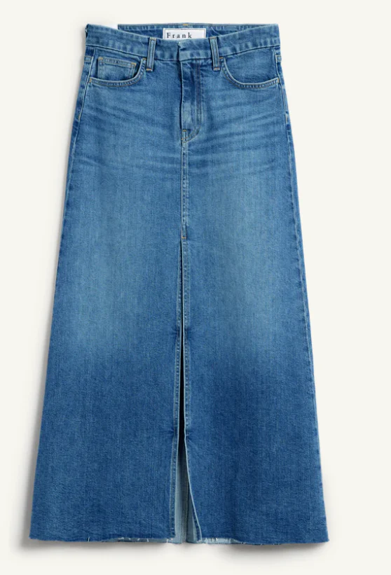 - The most elongating denim midi skirt ever! Designed for a high-rise with a slimming fit and midi-length.