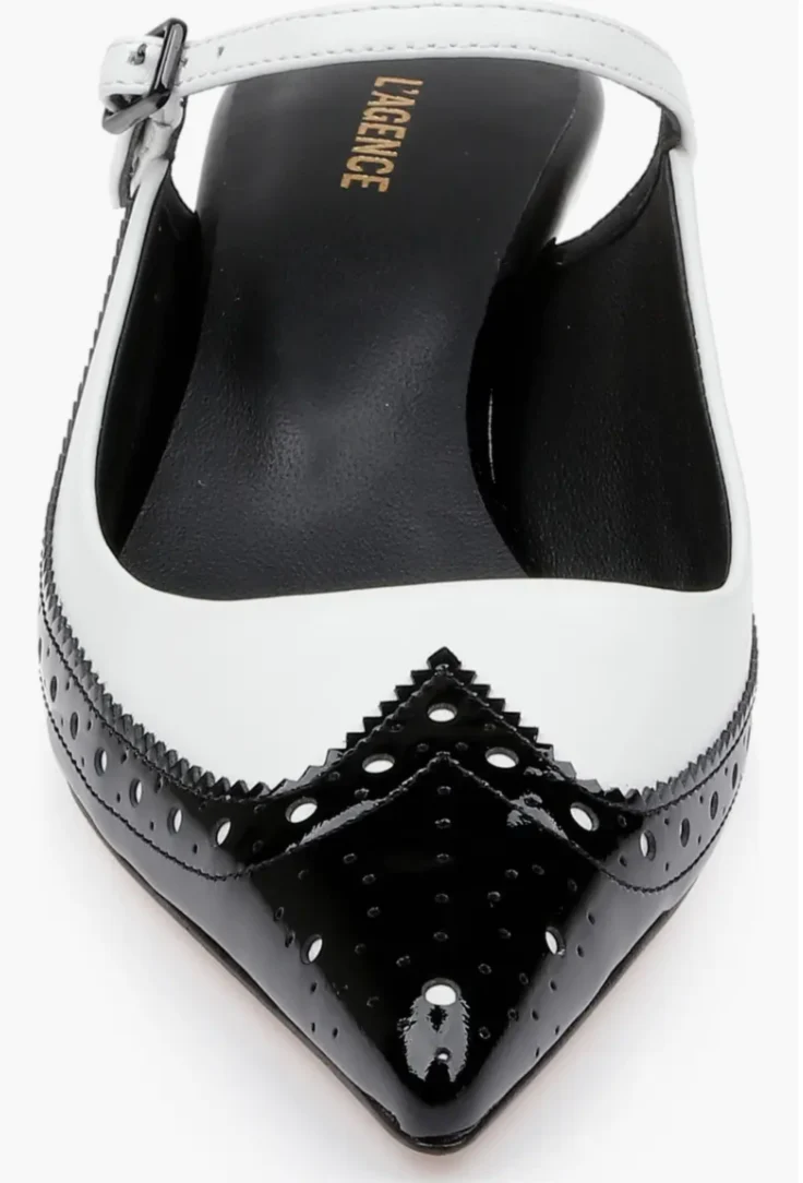 Wingtip styling and brogue perforations create a retro aesthetic on a maryjane mule balanced by a pointy toe and kitten heel.