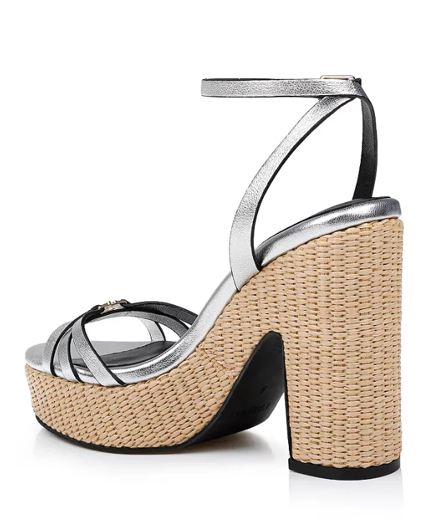 Embrace effortless style with this leather sandal, designed to elevate your weekend wardrobe. Signature hardware centers the slender vamp straps, creating a sleek and eye-catching look. The woven platform adds texture and interest, while the soaring block heel provides both height and stability for all-day wear.