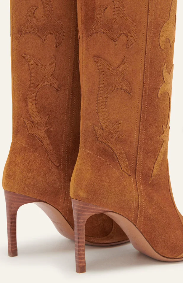 The Caitlin boots feature a thin heel which will make your legs look longer. Made from 100% split calfskin, their cute black shade is enhanced with arabesque topstitching. The top of the ankle boot fully embraces its western influences in a more feminine, glam version. They are easy to pull on with no zips or straps. Pair with a mini or midi dress or fitted jeans for an irresistible look.