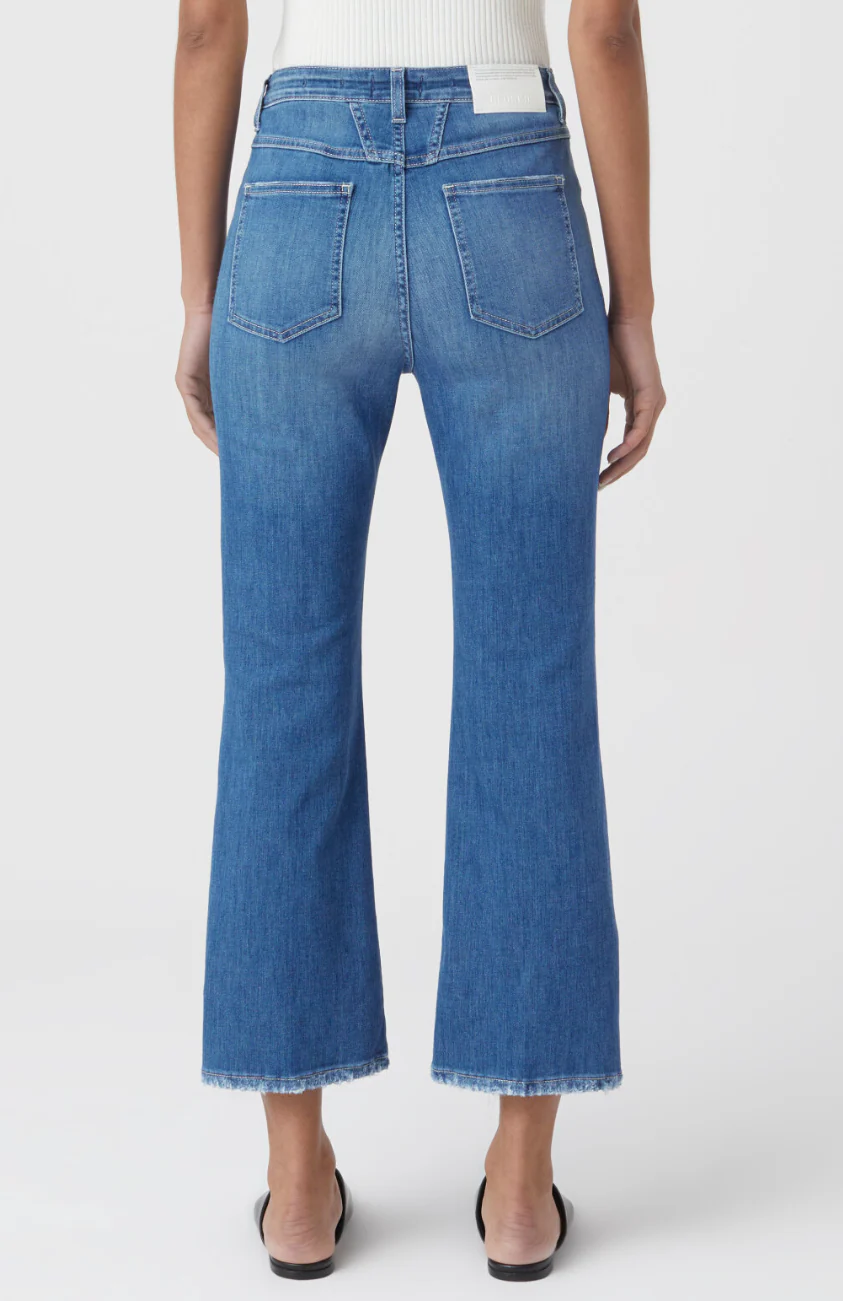 New slim fit Hi-Sun with high waist, flared leg and button fly. Made of organic power stretch denim with an intensive colouring and white details. Part of their sustainable denim line A BETTER BLUE.