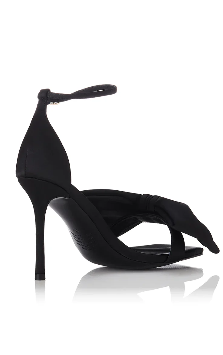The Minka shoe from Australian brand Alias Mae is a sexy, feminine and luxurious black heel with an open toe and bow detail. This satin shoe is sure to become your next go-to heel. A classy heel that you can wear for seasons to come.