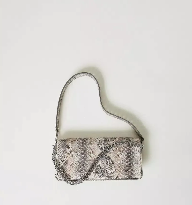 Small convertible bag made from faux smooth calf leather with python print, double strap – removable matching strap finished with metal eyelets and chain strap – flap and magnet closure, metal logo plate, lining.