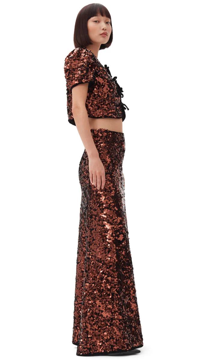 Shine bright with Ganni's stunning Brown Sequins Maxi Skirt! This eye-catching piece features a luxurious all-over sequin design that adds just the right amount of sparkle to any outfit. The convenient side zip closure ensures a flattering fit and easy wear. Perfect for special occasions or a night out, this maxi skirt effortlessly elevates your look while keeping you comfortable. Pair it with a sleek top and heels for a glamorous ensemble that’s sure to turn heads!